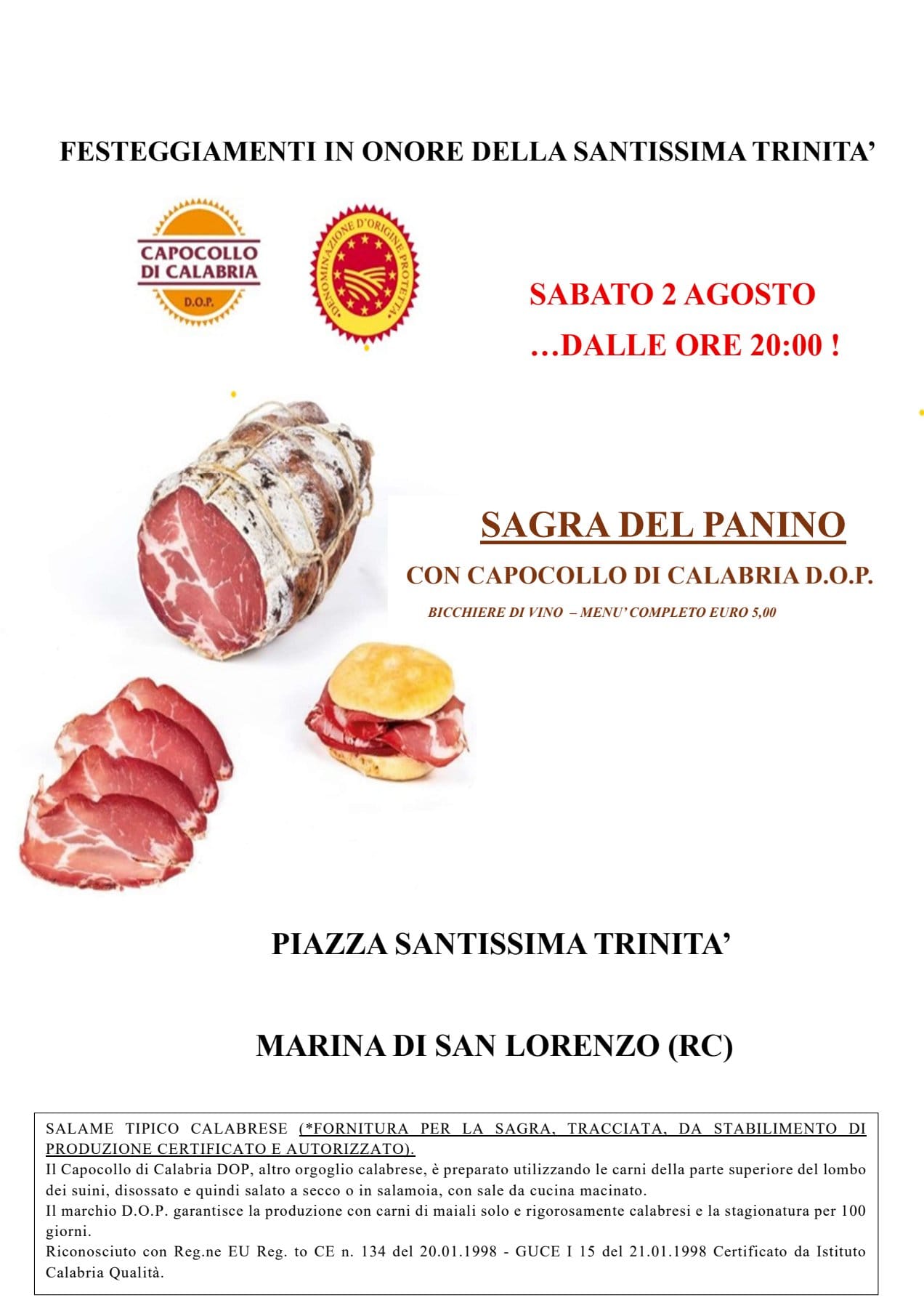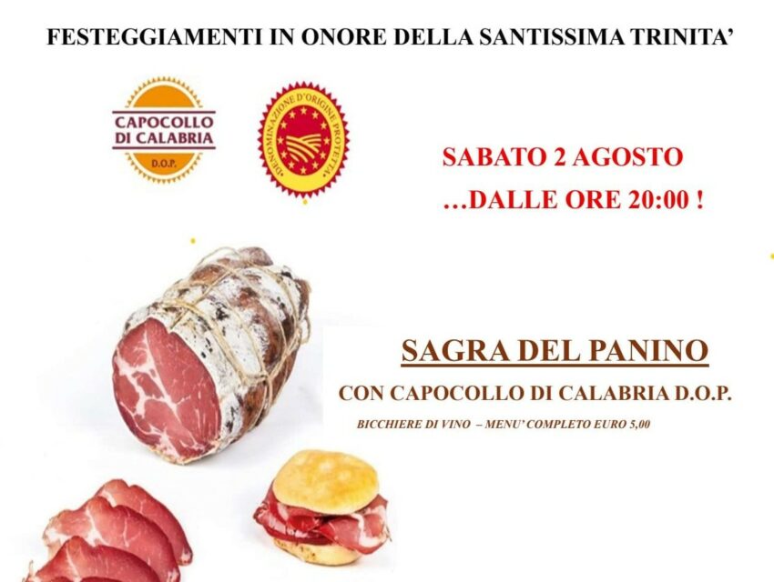 Un appuntamento da non perdere quello di sabato 2 agosto 2025 a Marina di San Lorenzo, dove i festeggiamenti in onore della Santissima Trinità si arricchiscono con la “Sagra del Panino con Capocollo di Calabria D.O.P.” e uno spettacolo musicale coinvolgente.