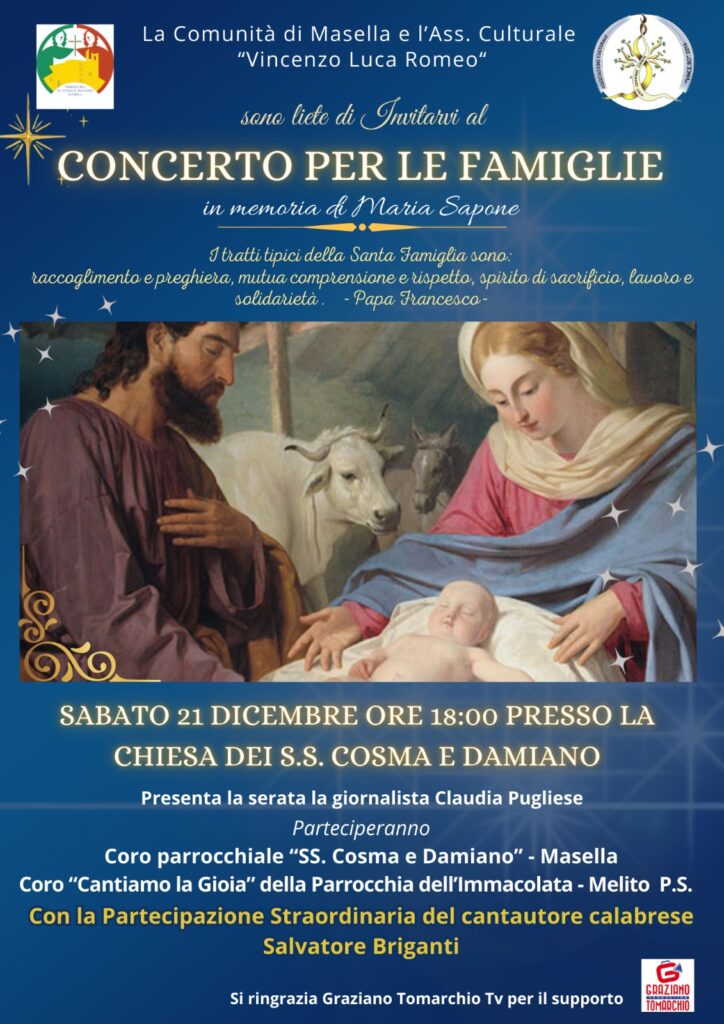 Un altro evento forte come comunità di Masella verrà vissuto sabato 21 dicembre alle ore 18, con il Concerto per le famiglie, che si conferma molto partecipato da diversi anni, permettendo a tutte le famiglie di ritrovarsi per riflettere sul vero valore del Natale, attraverso la musica e il canto. A Masella, quest’anno il concerto prevede la partecipazione di due cori parrocchiali: quello della chiesa dell’Immacolata “Cantiamo la Gioia” e quello dei “Ss. Cosma e Damiano” di Masella. Ci sarà la partecipazione straordinaria del cantautore calabrese Salvatore Briganti, autore di svariate canzoni Natalizie. A presentare la serata, la giornalista Claudia Pugliese. Iniziativa questa in cui sarà ricordata Maria Sapone, venuta a mancare troppo presto, componente del coro parrocchiale di Masella, sempre molto attiva in parrocchia.