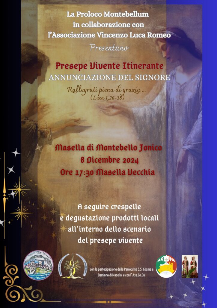 Il primo momento lo vivremo a Masella vecchia domenica 8 dicembre, ove avrà inizio, per la prima volta, il Presepe Vivente Itinerante in tutto il territorio comunale, promosso dalla Pro loco Montebellum e organizzato dall’associazione Vin.Ce.Ro, con la messa in scena dell’Annunciazione del Signore. Per questa iniziativa è stata richiesta la partecipazione di diversi figuranti e bambini.