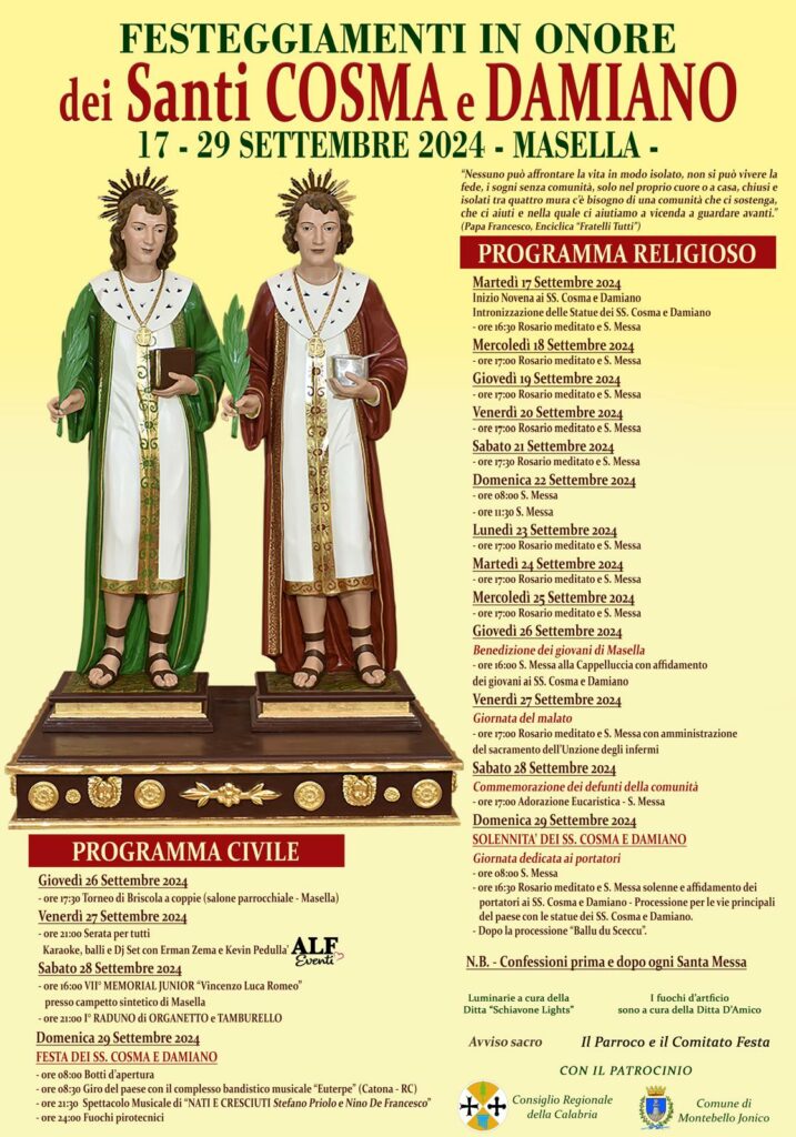 È, inoltre, previsto un programma civile che coinvolge tutta la comunità, a partire da giovedi 26 fino a domenica 29 settembre: il torneo di briscola; il karaoke e la discoteca in piazza di Alf Eventi; il torneo di calcetto dei più piccoli in memoria di Vincenzo Luca Romeo, organizzato dall’associazione Vin.Ce.Ro; il raduno di organetto e tamburello e la serata conclusiva che vedrà la presenza degli artisti Stefano Priolo e Nino De Francesco con tutta la band, i quali sono pronti a coinvolgere il pubblico presente, con il loro spettacolo pop calabrese intitolato “Nati e crisciuti”. A mezzanotte i fuochi pirotecnici chiuderanno i festeggiamenti dedicati ai Ss. Cosma e Damiano. “Divertiamoci, partecipiamo e viviamo la festa con spirito di condivisione, collaborazione e comunione”, conclude don Zampaglione, valori che ci fanno veri cristiani, alla luce della testimonianza dei nostri Santi.