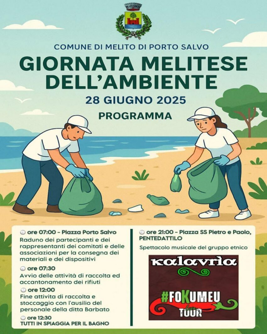 Il Comune di Melito di Porto Salvo promuove la Giornata Melitese dell’Ambiente, in programma sabato 28 giugno 2025. L’iniziativa, aperta a cittadini, comitati e associazioni, mira a rafforzare la sensibilità ecologica della comunità attraverso un gesto concreto: la pulizia delle spiagge.