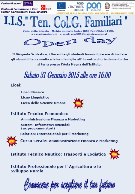 Si svolgerà Sabato 31.01.2015 nei locali dell’Aula Magna dell’Istituto d’Istruzione Superiore “Ten. Col. Giovanni Familiari” di Melito di Porto Salvo(RC) l‘Open Day finalizzato alle iscrizioni per il prossimo anno scolastico 2015/2016 che ha avrà come filo conduttore lo slogan: “Conoscere per scegliere il futuro”.