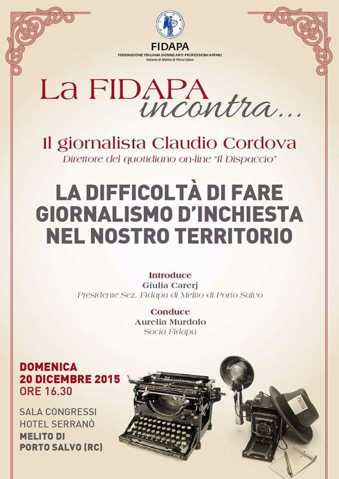 L’iniziativa si terrà domenica, 20 dicembre alle ore 16:30, presso la sala congressi, Hotel Serranò a Melito Porto Salvo. L’oggetto del dibattito sarà: “La difficoltà di fare giornalismo d’inchiesta nel nostro territorio”, i lavori saranno introdotti dal Presidente della Fidapa, dott.ssa Giulia Carerj, conduce Aurelia Murdolo, socia Fidapa.