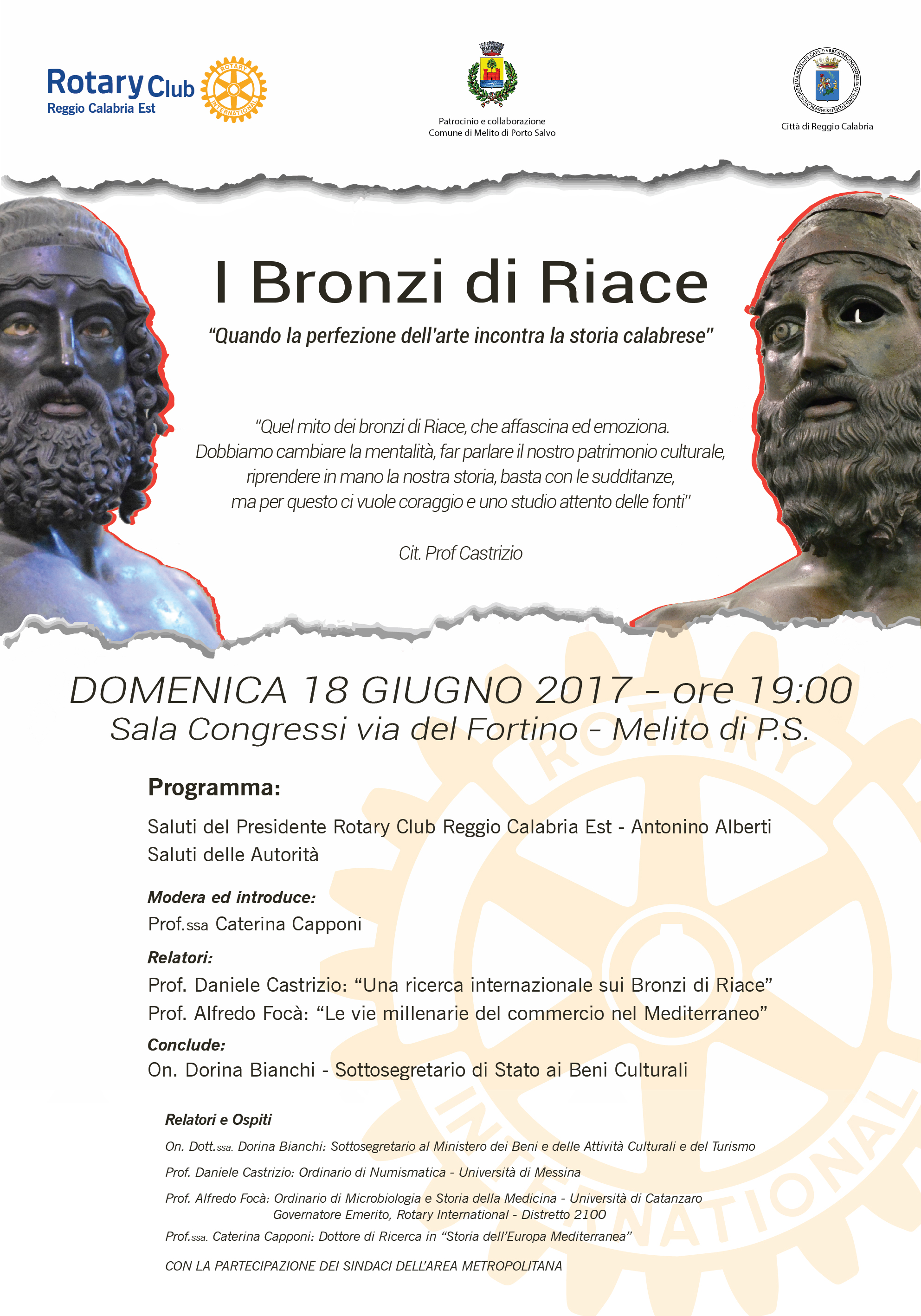 Domenica 18 giugno 2017 si terrà, presso il centro convegni di Via del Fortino, a Melito di Porto Salvo, il Convegno “I Bronzi di Riace- Quando la perfezione dell’arte incontra la storia calabrese” organizzato dal Rotary Club Reggio Calabria EST in collaborazione con il Comune di Melito Porto Salvo. L’evento è previsto per le ore 19.00.