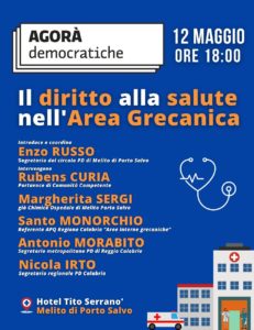 Il diritto alle cure e alla salute, è sancito dall’articolo 32 della Costituzione italiana ed è in questa prospettiva che è possibile parlare di diritto alla salute come diritto collettivo poiché assicurare l’assistenza sanitaria ai singoli permette, di tutelare l’intera comunità anche in ottica di prevenzione. Ma l’Area Grecanica, situata nel basso Jonio della provincia di Reggio Calabria, deve fare i conti con la condizione di disagio sociale di quei cittadini che hanno anche difficoltà a potersi muovere per raggiungere le più vicine strutture sanitarie. In tal senso, il Circolo di Melito di Porto Salvo del Partito Democratico ha organizzato per il 12 maggio 2022, con inizio alle ore 18,00, un incontro sul tema “Il diritto alla salute nell’Area Grecanica”. L’evento si terrà presso l’Hotel Tito Serranò dello stesso centro jonico e si inserisce nel percorso delle Agorà Democratiche ideate dal Partito Democratico come momenti di democrazia partecipativa.