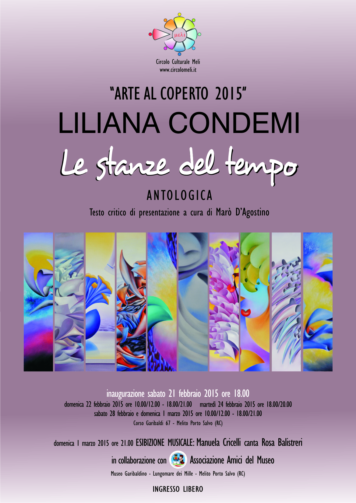 L’edizione 2015, che si svolgerà presso la sede di Corso Garibaldi a Melito Porto Salvo, ha coinvolto quest’anno la pittrice Liliana Condemi che presenterà un’antologia delle proprie opere: da qui il titolo “Le stanze del tempo” poiché ogni stanza accoglierà un particolare momento della vita della pittrice.