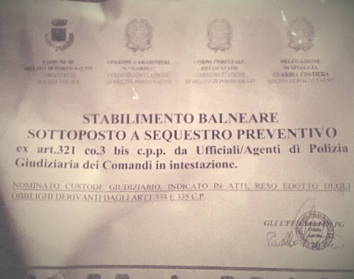 Chiusura di tre chioschi sul Lungomare dei Mille a Melito Porto Salvo di cui due sequestrati e uno in parte. Dunque gli stabilimenti balneari sono sottoposti a sequestro preventivo ex art.321 co.3 bis c.p.p. da Uffici/Agenti di Polizia Giudiziaria dei Comandi in intestazione. Nominato custode giudiziario, indicato nell’atto e reso edotto dagli obblighi derivanti dagli artt.334 e 335 c.p. firmato dagli ufficiali di Pg, Francesco Pirrello.