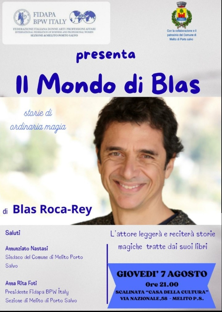 Una serata speciale nel cuore dell’estate melitese, tra emozioni, magia e parole: è quella in programma giovedì 7 agosto alle ore 21.00 a Melito di Porto Salvo, con l’evento “Il Mondo di Blas – storie di ordinaria magia”, un incontro con l’attore e autore Blas Roca-Rey, che leggerà e reciterà brani tratti dai suoi libri.