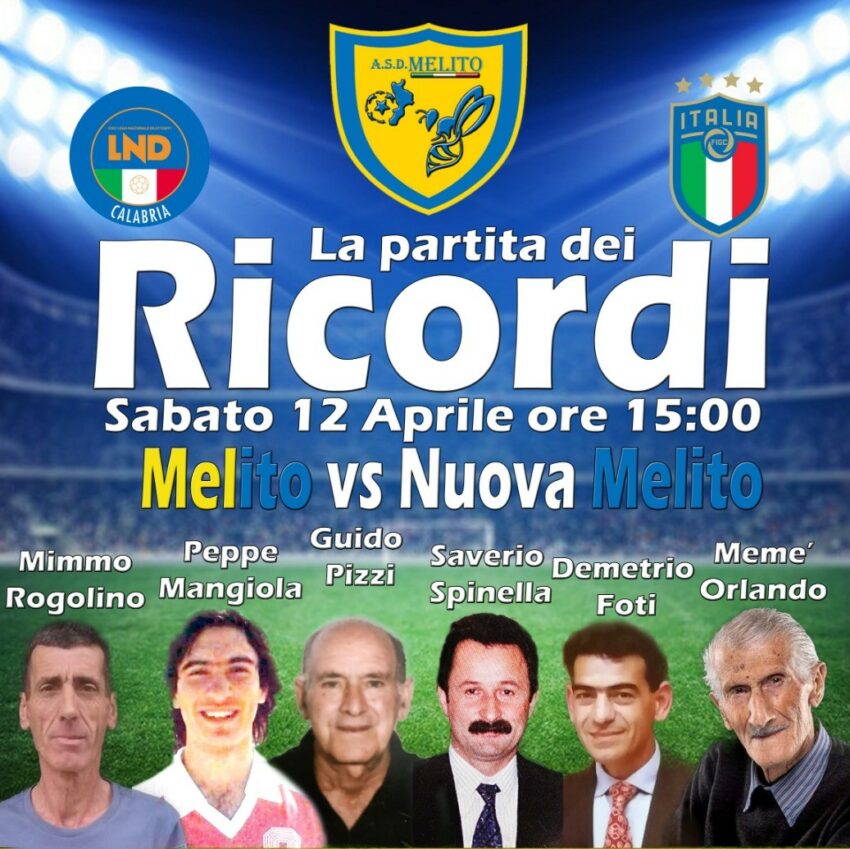 Melito di Porto Salvo (RC). È tutto pronto per La partita dei Ricordi, in programma sabato 12 aprile alle ore 15:00 presso lo Stadio Saverio Spinella di Melito di Porto Salvo. L’incontro vedrà sfidarsi le due squadre Melito e Nuova Melito, un vero e proprio omaggio alla storia calcistica locale e ai protagonisti che hanno lasciato il segno nel calcio del territorio.
