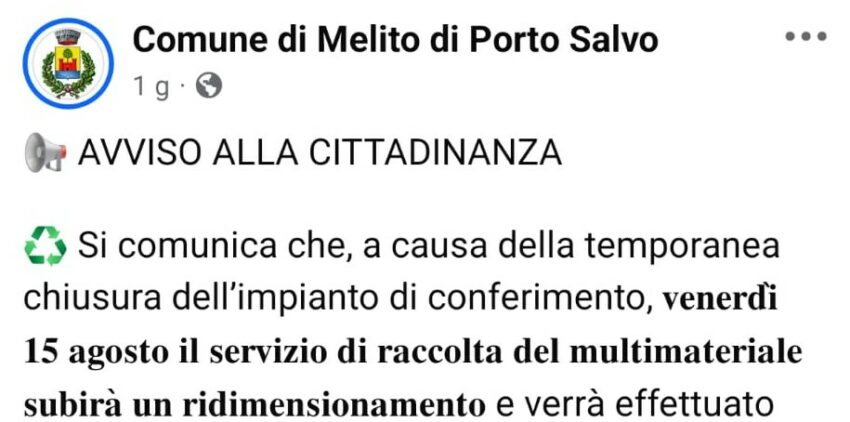 Il Comune di Melito di Porto Salvo ha informato la cittadinanza di una temporanea riduzione del servizio di raccolta del multimateriale nella giornata di venerdì 15 agosto.