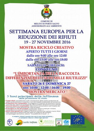 La manifestazione “Settimana europea per la riduzione dei rifiuti”, organizzata dal Comune di Melito P. S. e dall’Assessorato all’Ambiente, con la relativa mostra sul riciclo creativo, si protrarrà fino al 27 novembre.