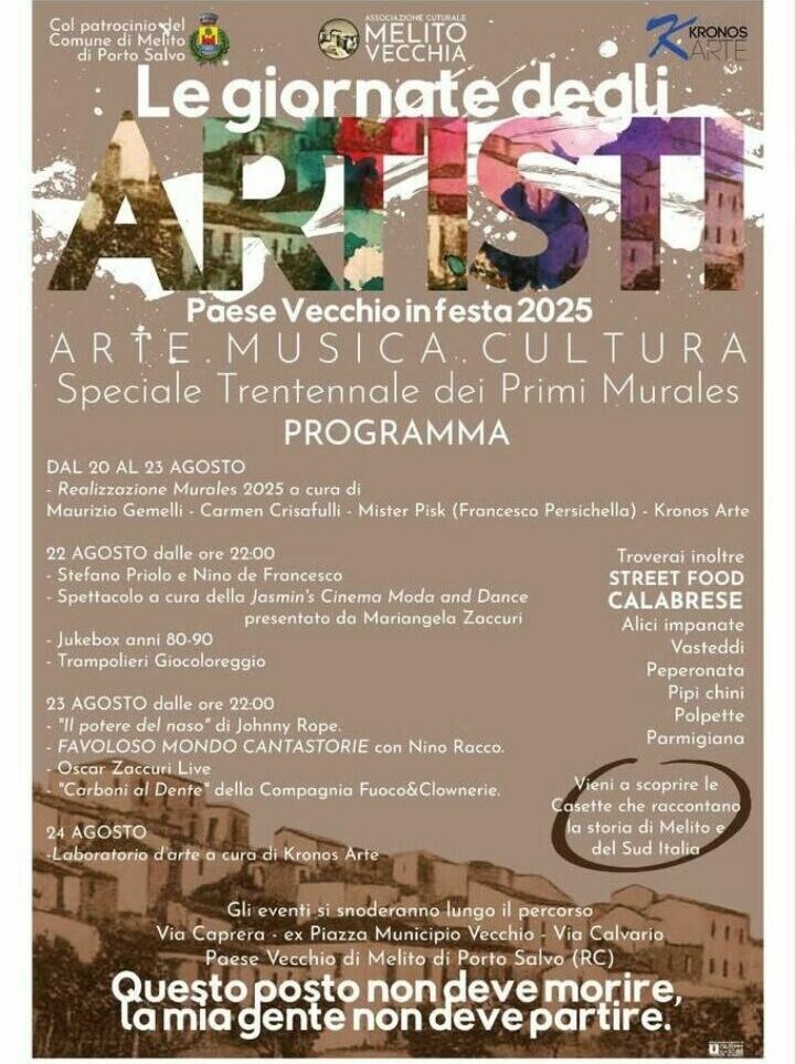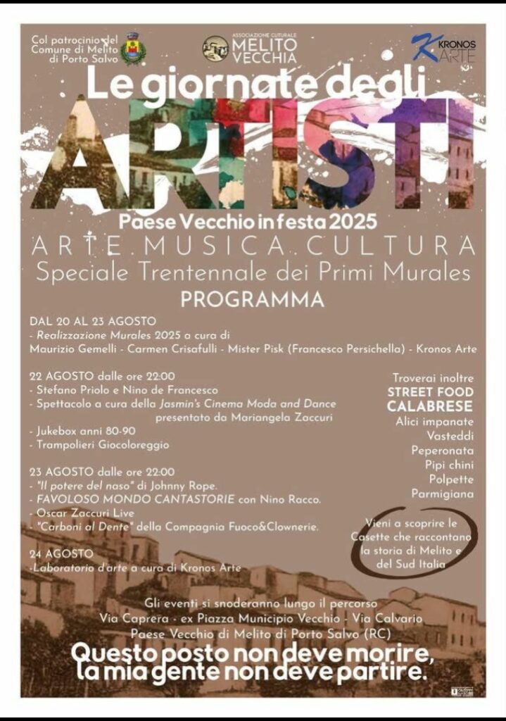 Il Paese Vecchio di Melito di Porto Salvo si trasformerà in un laboratorio a cielo aperto grazie alla nuova edizione de “Le giornate degli artisti – Paese Vecchio in festa 2025”, manifestazione che quest’anno avrà un significato speciale: il trentennale dei primi murales.