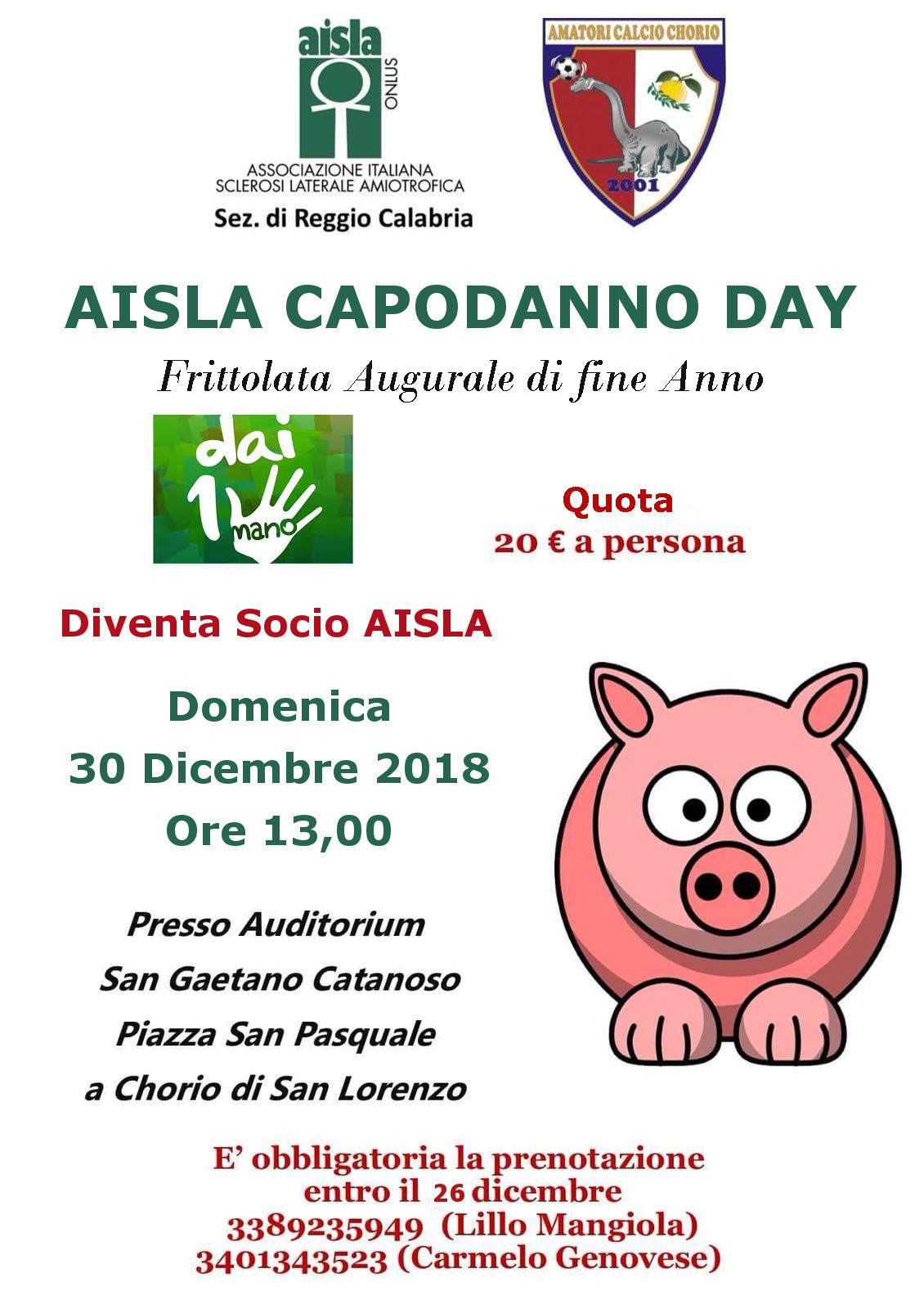 L’evento, promosso dall’associazione “Amatori Calcio Chorio” e dagli “Amici di Cecio”, ha inoltre, scopo benefico. Il ricavato della giornata sarà infatti devoluto alla sezione reggina dell’AISLA, guidata dalla presidente Dott.sa Francesca.