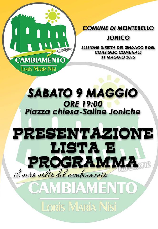 Incontro pubblico, sabato 9 maggio, ore 18:45 presso piazza chiesa a Saline Joniche . Durante l’appuntamento verrà presentata la lista “Direzione Cambiamento” con candidato a sindaco Loris Maria Nisi , i candidati a consigliere e il programma.