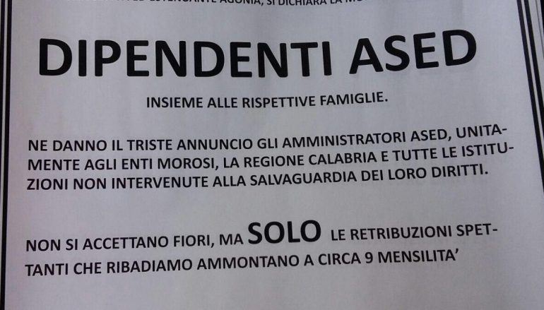 Nel manifesto inoltre, viene aggiunto che “ne danno il triste annuncio gli amministratori Ased, unitamente agli enti morosi. E ancora la Regione Calabria. E tutte le Istituzioni non intervenute alla salvaguardia dei loro diritti”. Parole che non ammettono repliche e che fanno comprendere come non sembra ci siano vie d’uscita. Ingenti le somme che i vari comuni morosi devono versare nelle casse dell’azienda. A tutto discapito dei lavoratori.