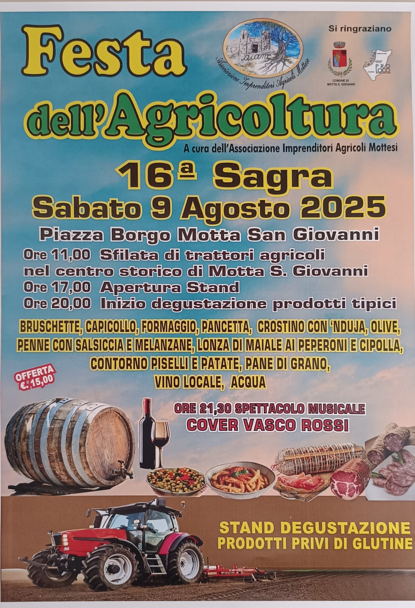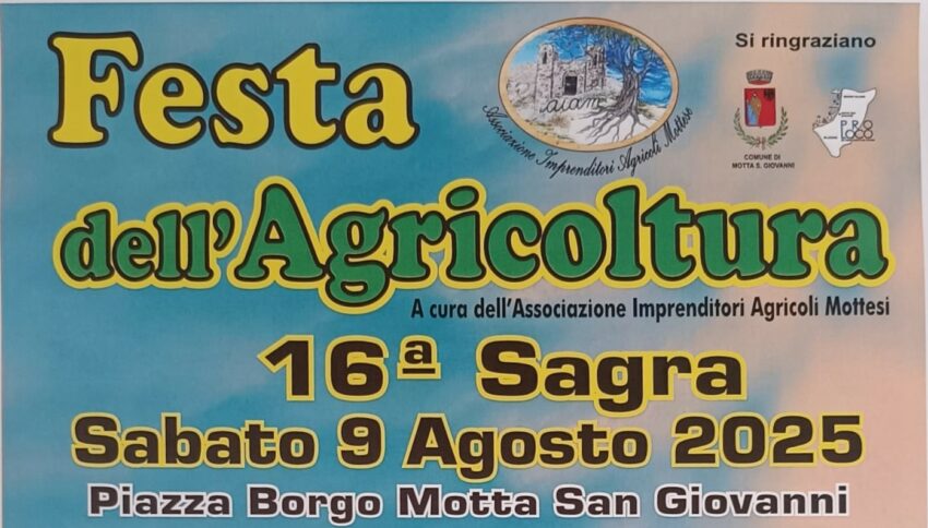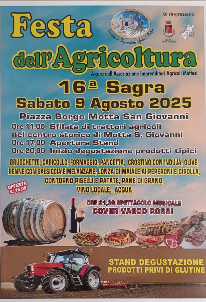 Torna un appuntamento che ormai è da definire storico nell’estate calabrese: la Festa dell’Agricoltura, giunta alla sua sedicesima edizione, animerà il borgo di Motta San Giovanni sabato 9 agosto 2025 con sapori autentici, tradizioni e tanta musica.