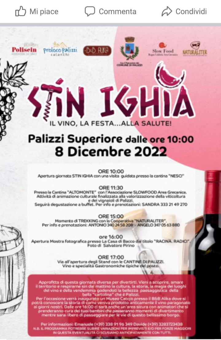 “Stin Ighia“, il vino, la festa…alla salute! E’ questo il titolo della festa organizzata nel borgo di Palizzi Superiore nella giornata di oggi, 8 Dicembre 2022.