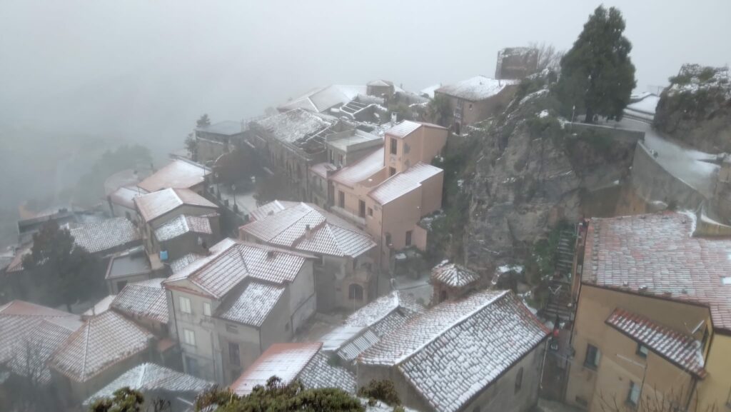 Risveglio sotto la neve a Roccaforte del Greco e Bova, nell’Area Grecanica. Come si vede dalle foto, i due paesi montani si sono riscoperti imbianchiati.