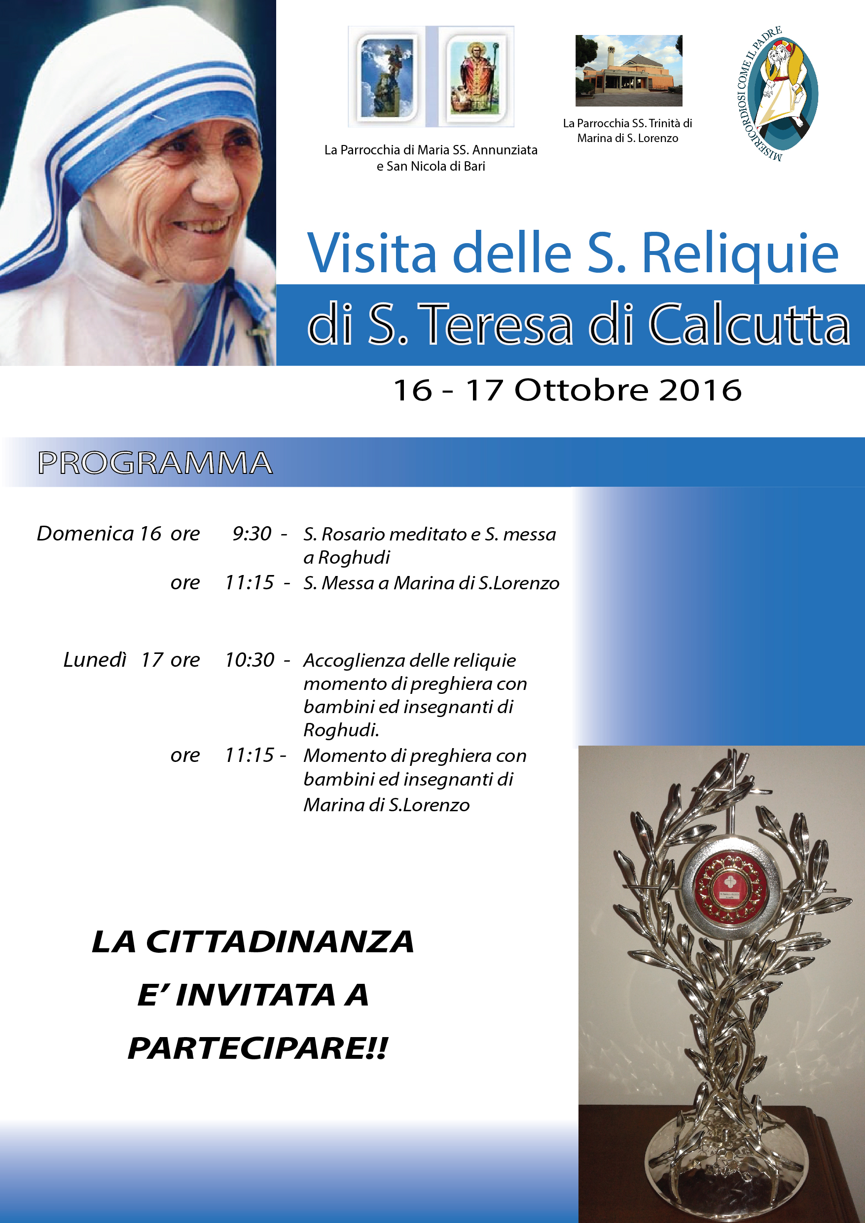 Le comunità parrocchiali di Marina di San Lorenzo e Roghudi annunciano con gioia la visita delle Reliquie (ex Capillis) di S. Teresa di Calcutta che è stata canonizzata da Papa Francesco il 4 settembre scorso, nei giorni 16 e 17 Ottobre 2016.