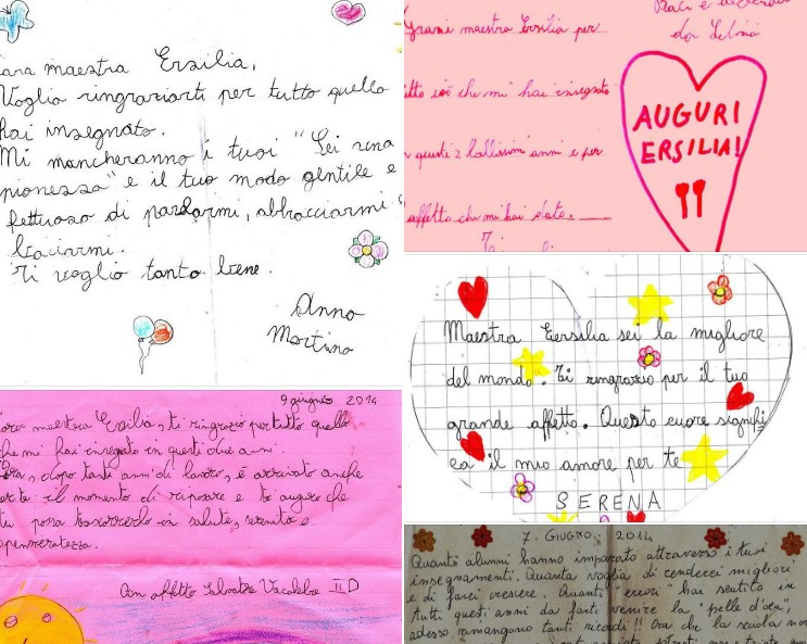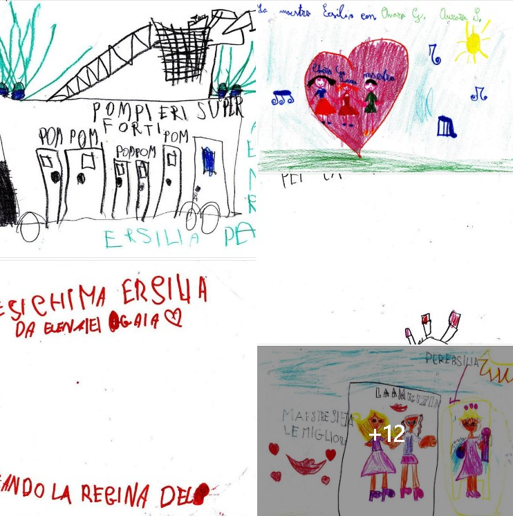 Nei vari anni la maestra Ersilia ha lasciato un segno indelebile negli alunni che hanno avuto la fortuna di averla come insegnante. Alunni che adesso sono diventati uomini e donne e che vorranno ricordare con un sorriso i suoi modi gentili. Di seguito vari disegni fatti negli anni che Ersilia custodiva gelosamente.