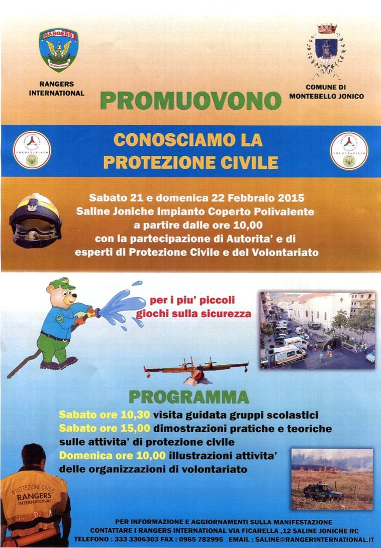 I Rangers International e la Commissione Straordinaria per la gestione del Comune di Montebello Ionico, nella fattispecie i dottori Muccio, Giaccari e Giliberto, promuovono una manifestazione con tema “CONOSCIAMO LA PROTEZIONE CIVILE” per sabato 21 e domenica 22 febbraio 2015 a Saline Joniche presso l’Impianto Polivalente (lato rotatoria) con inizio alle ore 10.00. A tale evento partecipano Autorità e Esperti di protezione Civile e del Volontariato. Oltre ai Rangers International sono presenti Vigili del Fuoco, Corpo Forestale dello Stato, Polizia Provinciale, Protezione Civile Provinciale e Regionale, Associazioni di Volontariato e di Protezione Civile che operano per la tutela del territorio, nel campo dell’ assistenza sociale, della protezione civile, della vigilanza e spegnimento incendi boschivi, nel primo soccorso.