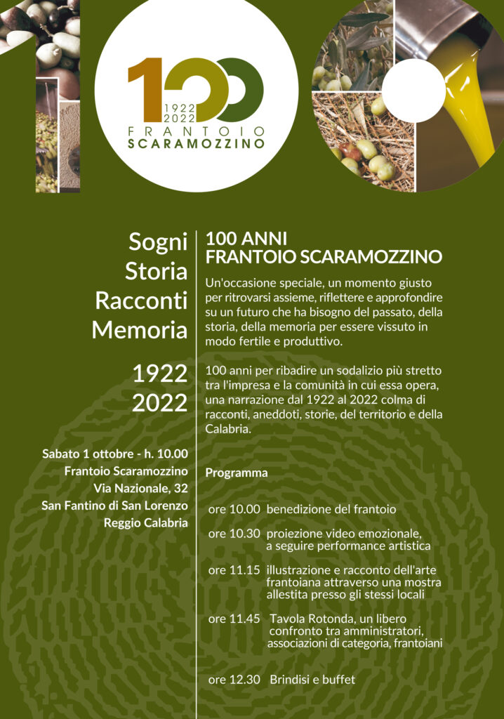 I 100 anni del frantoio Scaramozzino a San Fantino di San Lorenzo. Tutto pronto per il grande evento che si terrá alle porte del Parco Nazionale dell’Aspromonte. Sabato 1 Ottobre colleghi, amministratori pubblici e associazioni di categoria per festeggiare, assieme al centenario del Frantoio, l’olio e l’olivicoltura.