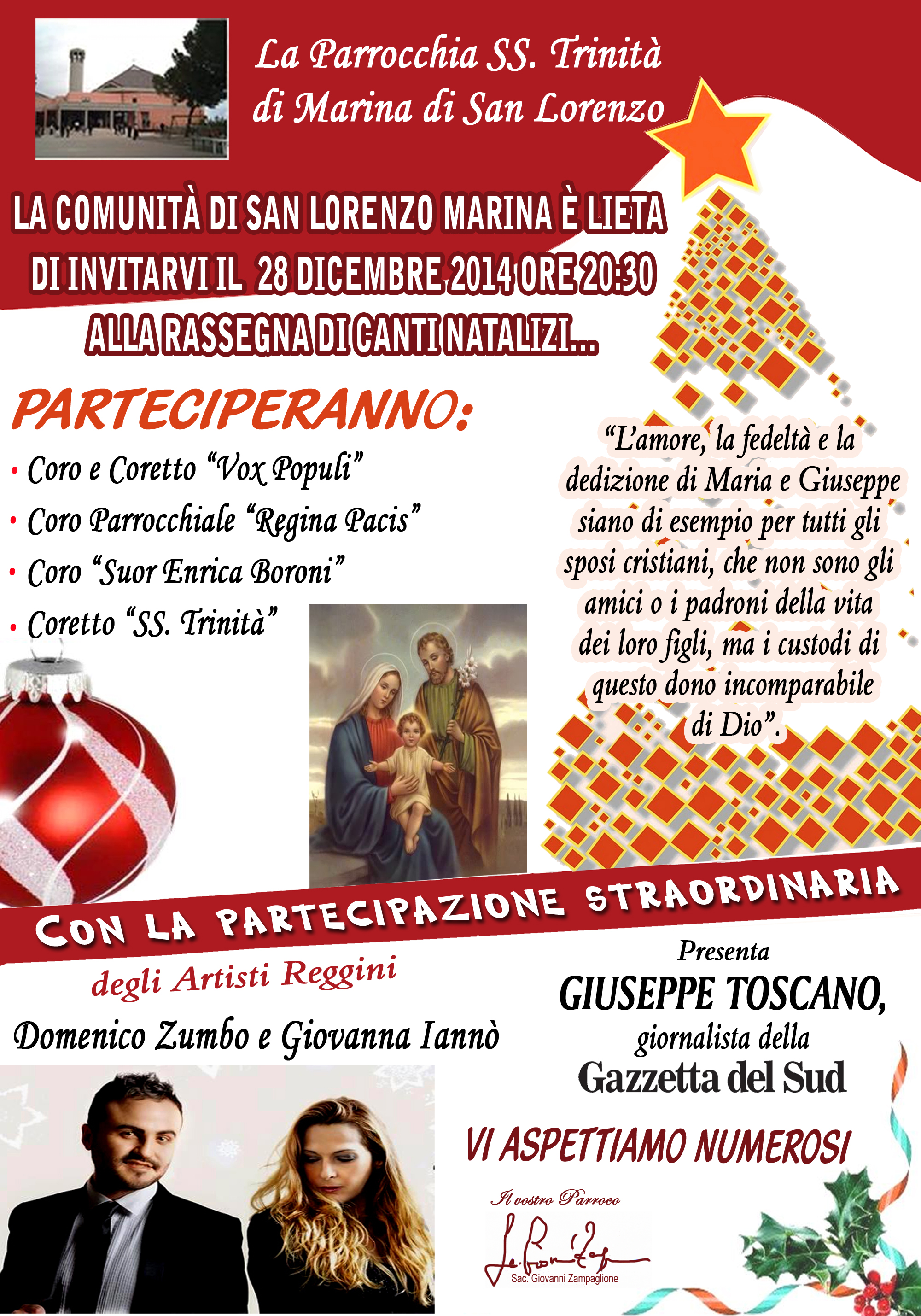 Giorno 28 Dicembre alle ore 20:30, in occasione della festa della Sacra Famiglia, di Gesù, Giuseppe e Maria, la parrocchia di SS. Trinità di Marina di San Lorenzo, in provincia di Reggio Calabria, organizza un concerto di Natale per tutte le famiglie.