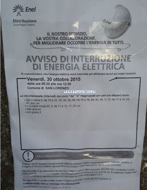 Venerdì 30 ottobre 2015, nel Comune di San Lorenzo, dalle ore 08.30 alle ore 12.30 verrà interrotta l’erogazione di energia elettrica per effettuare lavori sugli impianti.