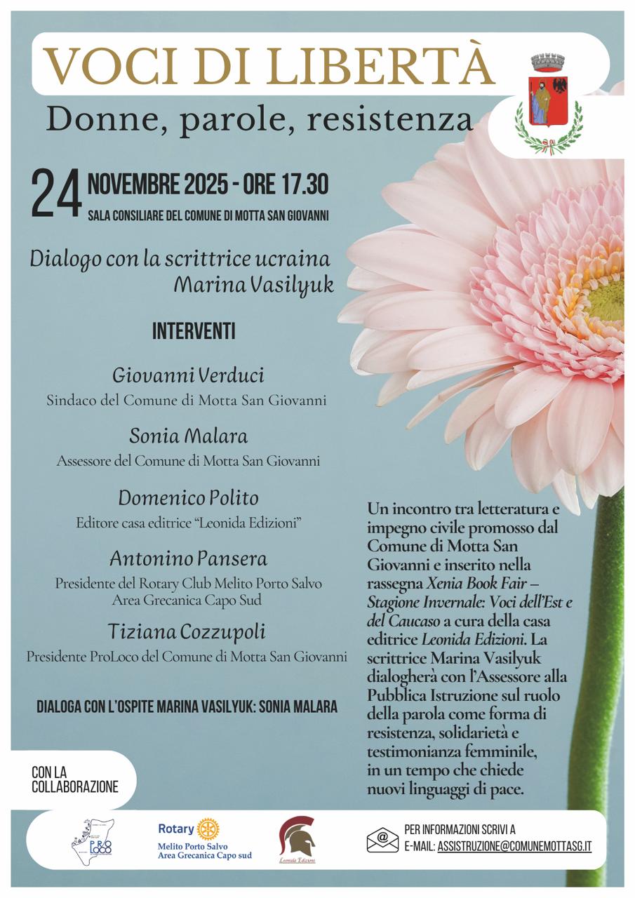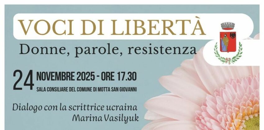 Un dialogo sulla forza della parola. È questo il cuore di “Voci di Libertà: Donne, parole, resistenza”, l’incontro che si terrà il 24 novembre 2025 nella Sala Consiliare del Comune di Motta San Giovanni. Un appuntamento che unisce letteratura, impegno civile e testimonianza femminile. Un evento che rafforza il ruolo del territorio come luogo di confronto culturale.