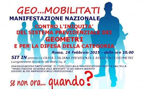 Alla manifestazione parteciperà una delegazione della “Mobilitazione Generale degli Avvocati M.G.A.” e l’indomani, venerdì 27 febbraio 2015, una delegazione dei Geometri parteciperà, assieme agli “Archivisti in Movimento”, ingegneri, architetti, e geologi del “Comitato Professioni Tecniche” alla manifestazione promossa in Roma dall’M.G.A. e dalla Federazione Nazionale Parafarmacie Italiane (F.N.P.I.) per l’equità fiscale e previdenziale.