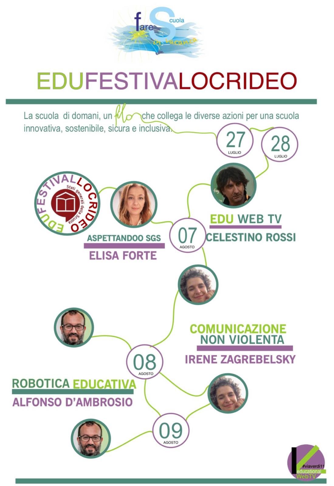 Il 27 e 28 luglio e poi il 7-8-9 agosto, la seconda edizione di “Fare scuola in vacanza” ospita il “Festival delle Educazioni Locridee”. EDUFESTIVALOCRIDEO, evento formativo ideato e promosso dall’associazione “Via Verdi 11- Educational WebTV”, con il patrocinio del Comune di Locri, dell’Ufficio Scolastico regionale, della Regione Calabria e Gal Terre Locridee, è dedicato a docenti di ogni ordine e grado, educatori e a tutti coloro che si occupano di scuola nel territorio locrideo ma anche nell’intero territorio calabrese.