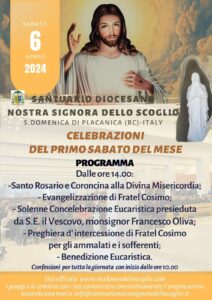 Sabato 6 aprile, presso il santuario diocesano di Nostra Signora dello Scoglio, in Santa Domenica di Placanica, nell’ambito delle celebrazioni dei primi sabati del mese, presiedute dal vescovo diocesano, monsignor Francesco Oliva, avrà luogo un incontro di preghiera pomeridiano, che prevede la solenne concelebrazione eucaristica, la preghiera di intercessione di Fratel Cosimo, per la guarigione dei malati e dei sofferenti, la benedizione eucaristica. Fratel Cosimo, fondatore della rinomata opera mariana, aprirà, come sempre, l’incontro pomeridiano con una evangelizzazione. Quì di seguito, riportiamo, integralmente, quella da lui effettuata, dopo aver invitato tutti ad elevare una preghiera (l’Ave Maria) alla Madonna, il primo sabato del mese di marzo: “Cari fratelli e sorelle, siate tutti benvenuti in questo Santuario mariano Nostra Signora dello Scoglio.