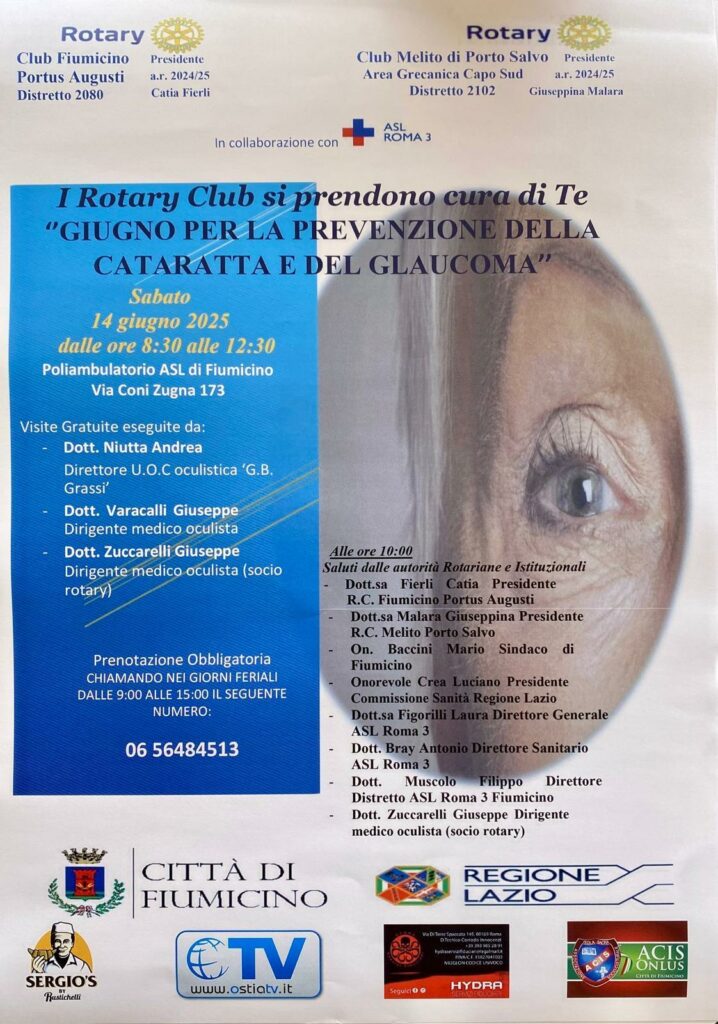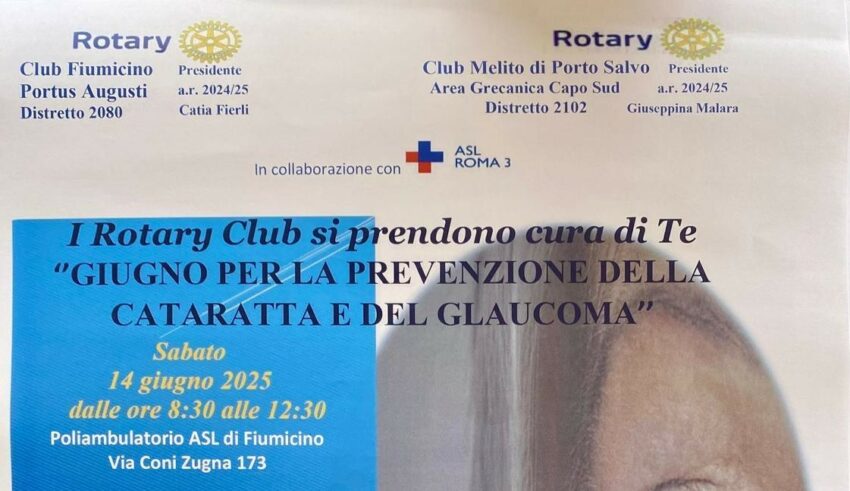 il Rotary Club Fiumicino Portus Augusti e il Rotary Club Melito di Porto Salvo organizzano una giornata dedicata alla prevenzione della cataratta e del glaucoma, con visite oculistiche gratuite presso il Poliambulatorio ASL di Fiumicino.