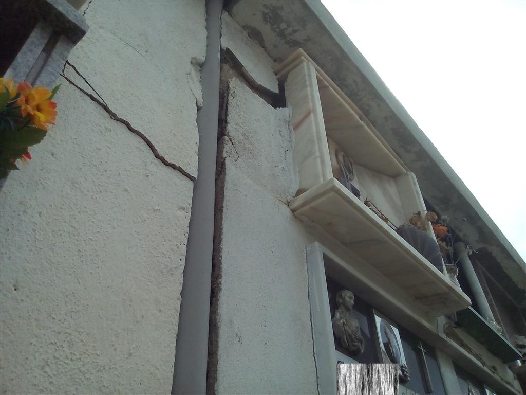 Fortunatamente l’odierno evento non ha recato danni alle persone. In ogni modo l’area va, come già richiesto, subito inibita al pubblico e consolidare i loculi perché altre lapidi son pronte a staccarsi e non si può escludere il crollo dei loculi che minacciano rovina, atteso che, come in precedenza segnalato, gli stessi presentano profonde e diffuse lesioni prevalentemente orizzontali lungo le facciate dei loculi ricadenti all’interno del cimitero, ma soprattutto lungo le pareti esterne lato monte, contro le quali si appoggia un vasto terrapieno, le cui funzioni di sostegno sono demandate alla parete dei loculi, di conseguenza si potrebbe produrre una spinta da determinare il crollo delle strutture.