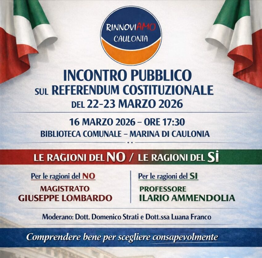 CAULONIA – Un momento di confronto pubblico per approfondire il tema del prossimo referendum costituzionale. L’iniziativa è stata organizzata dal gruppo “Rinnoviamo Caulonia” e si terrà lunedì 16 marzo 2026 alle ore 17:30 presso la Biblioteca comunale di Marina di Caulonia.