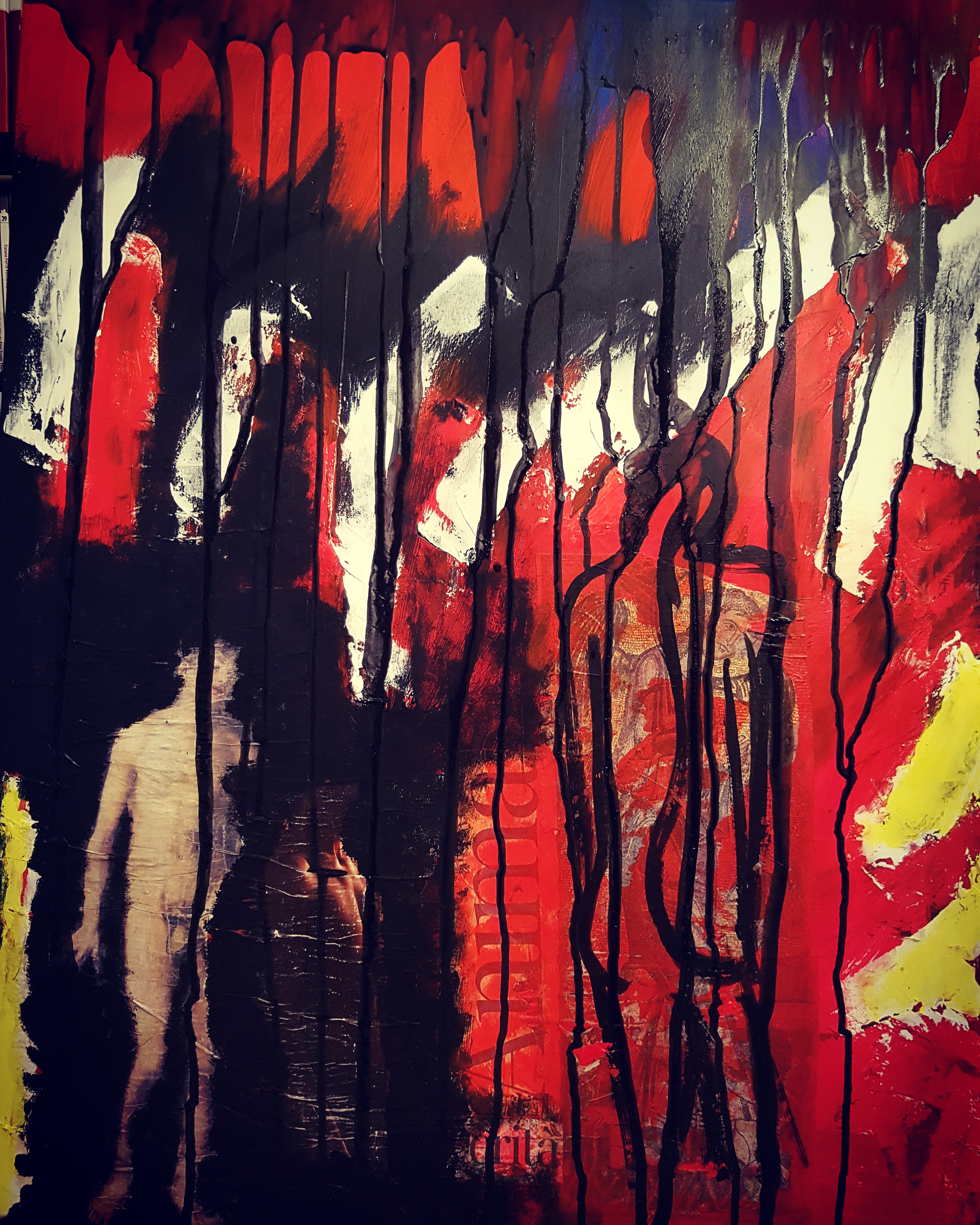 In quest’opera Ferragina indaga il concetto teologico di umanità, come inteso nella teologia paolina. Il corpo, la carne, nella quale l’uomo vive e con la quale si presenterà a Dio è proprio ciò che lo porta ad allontanarsi da Lui. Nell’opera appare Adamo fatto di carne, prototipo di tutti gli uomini che abitano la condizione umana. Ma è proprio questa condizione umana che il Dio cristiano sceglie per incarnarsi. Concetto teologicamente elevato e drammatico, che nell’opera viene esaltato da un velato nero che scorre su uno sfondo insanguinato, simbolo dell’umana fallibilità. La figura dell’Angelo,che si innesta nella sagoma dell’uomo, mostra la scelta del divino di farsi umano. Scelta salvifica. E’ la Redenzione. L’opera concentra la formazione teologica di Massimiliano Ferragina, attualizzata in una costruzione artistica fortemente simbolica e dogmatica.