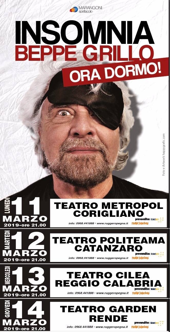 Dopo undici anni di assenza con suoi spettacoli (ultimo al palasport di Crotone nel 2008), Beppe Grillo sta per tornare in Calabria con quattro tappe del suo nuovo one man show “Insomnia – Ora dormo”.
