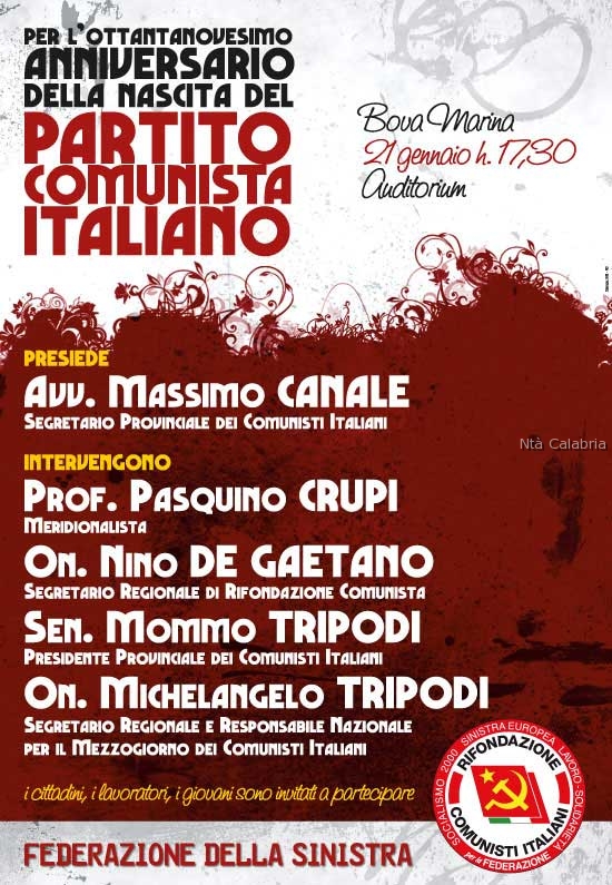Il 21 Gennaio alle ore 17.30 presso l’Auditorium di Bova Marina si terrà questo importante appuntamento che prevederà gli interventi di vari esponenti del Partito Comunista Italiano.