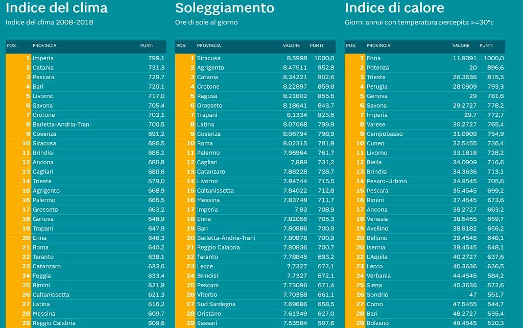 Qual è la città italiana col clima migliore? A questa domanda risponde il “Il Sole 24 ore”, che ha pubblicato sul suo sito l’Indice del clima, una classifica che tiene conto di dieci fattori riguardanti le performance meteorologiche dal 2008 al 2018. E quindi: soleggiamento, indice di calore, ondate di calore, eventi estremi, brezza estiva, umidità relativa, raffiche di vento, piogge, nebbia e giorni freddi. L’indice è stato elaborato attingendo «da un database di oltre 1,84 stringhe di valori – scrive il Sole 24 Ore – circa 16mila per ciascuna città. A fornirli 3B Meteo, società del gruppo Meteosolutions srl».