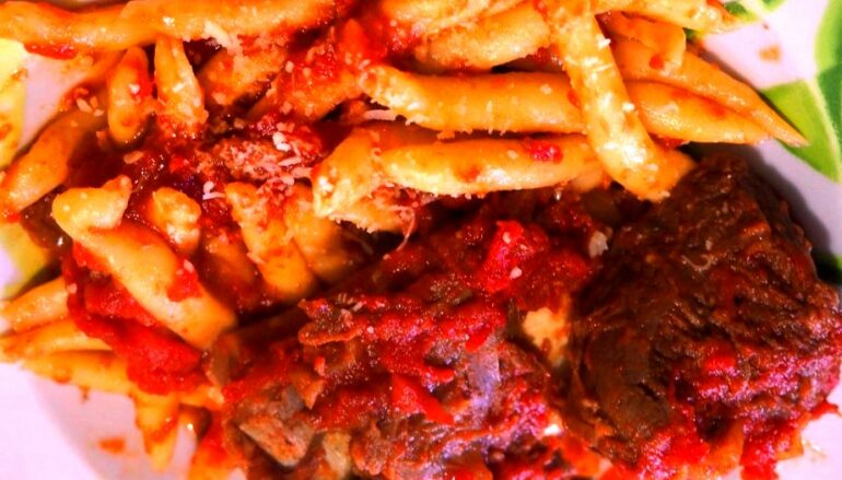 Nel frattempo, tagliate a piccoli pezzi la carne di capra e fatela rosolare (per oltre 30 minuti) in una “tiana” possibilmente di terracotta, con olio, una spruzzata di vino bianco, uno spicchio di aglio tritato e una cipolla a pezzi. Trascorsi i 30 minuti versate nella tiana una bottiglia di conserva fatta in casa, salate, aggiungete un po’ di origano selvatico, un pizzico di pepe nero, una foglia d’alloro e lasciate cuocere a fuoco lento finché non ritenete cotta la carne di capra. Quando il sugo è pronto, calate i maccheroni destro una pentola contenente acqua che bolle e lasciate cuocere per 10 minuti circa, mescolando di tanto in tanto. Quando i maccheroni sono al dente, condite col sugo e, dopo aver impiattato, spolverizzate con pecorino.