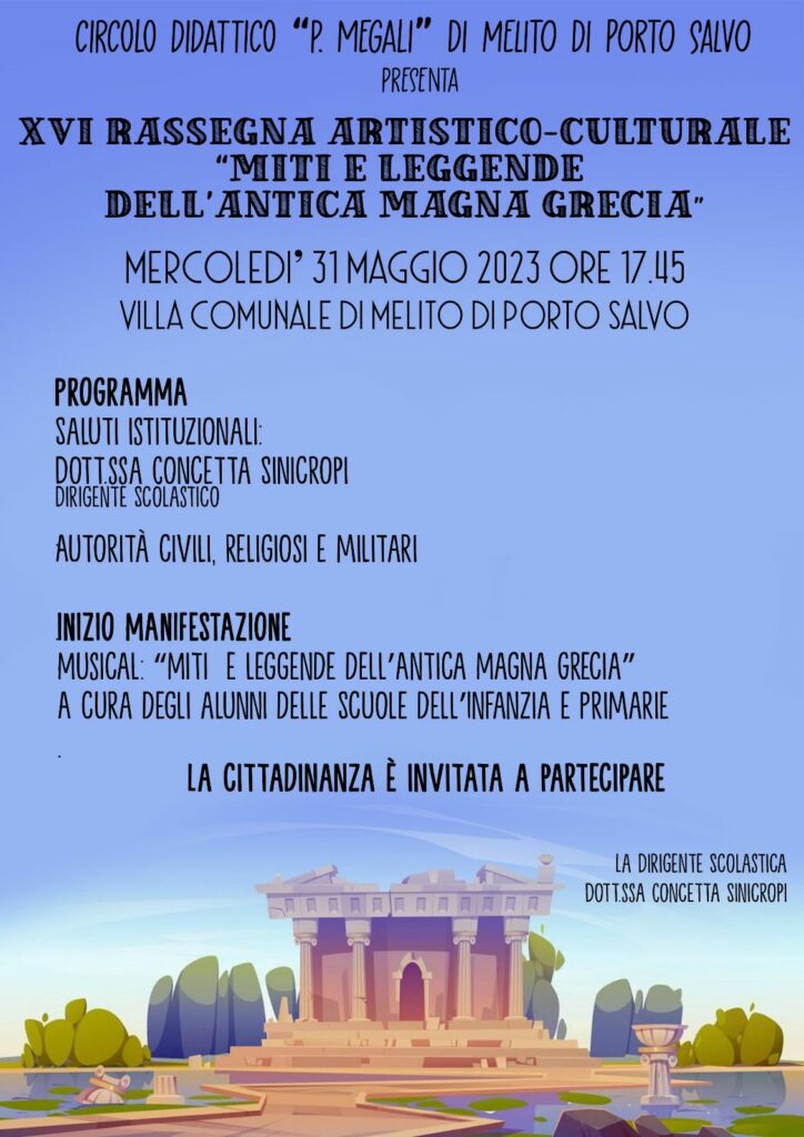 Oggi, Mercoledí 31 Maggio, si terrá a Melito Porto Salvo la XVI Rassegna Artistico-Culturale “Miti e Leggende dell’Antica Magna Grecia”. L’evento, con inizio alle 17:45, é stato organizzato dal Circolo Didattico “P.Megali”.
