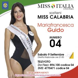 La Carlifashionagency diretta da Linda Suriano, agente regionale del concorso Miss Italia in Calabria, chiede a tutti i calabresi di sostenere MariaFrancesca Guido, Miss Calabria, che gareggia con il numero 04. Si può votare nella giornata di sabato 9 settembre, durante la diretta televisiva, attraverso una telefonata o con un sms.