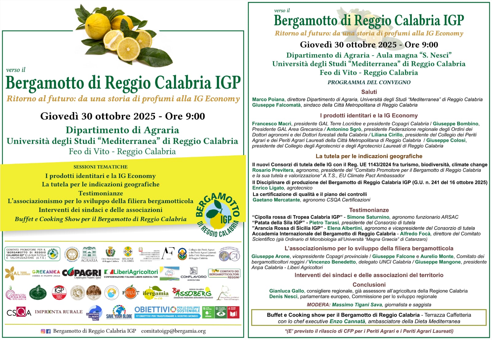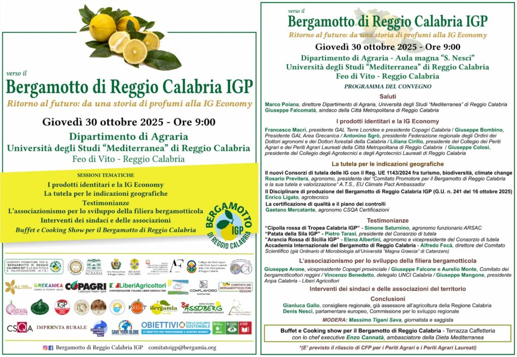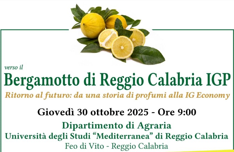 Il profumo e l’identità del territorio reggino tornano protagonisti con il convegno “Verso il Bergamotto di Reggio Calabria IGP – Ritorno al futuro: da una storia di profumi alla IG Economy”, in programma giovedì 30 ottobre 2025, alle ore 9:00, presso il Dipartimento di Agraria dell’Università degli Studi “Mediterranea” di Reggio Calabria (Feo di Vito – Aula Magna “S. Nesi”).