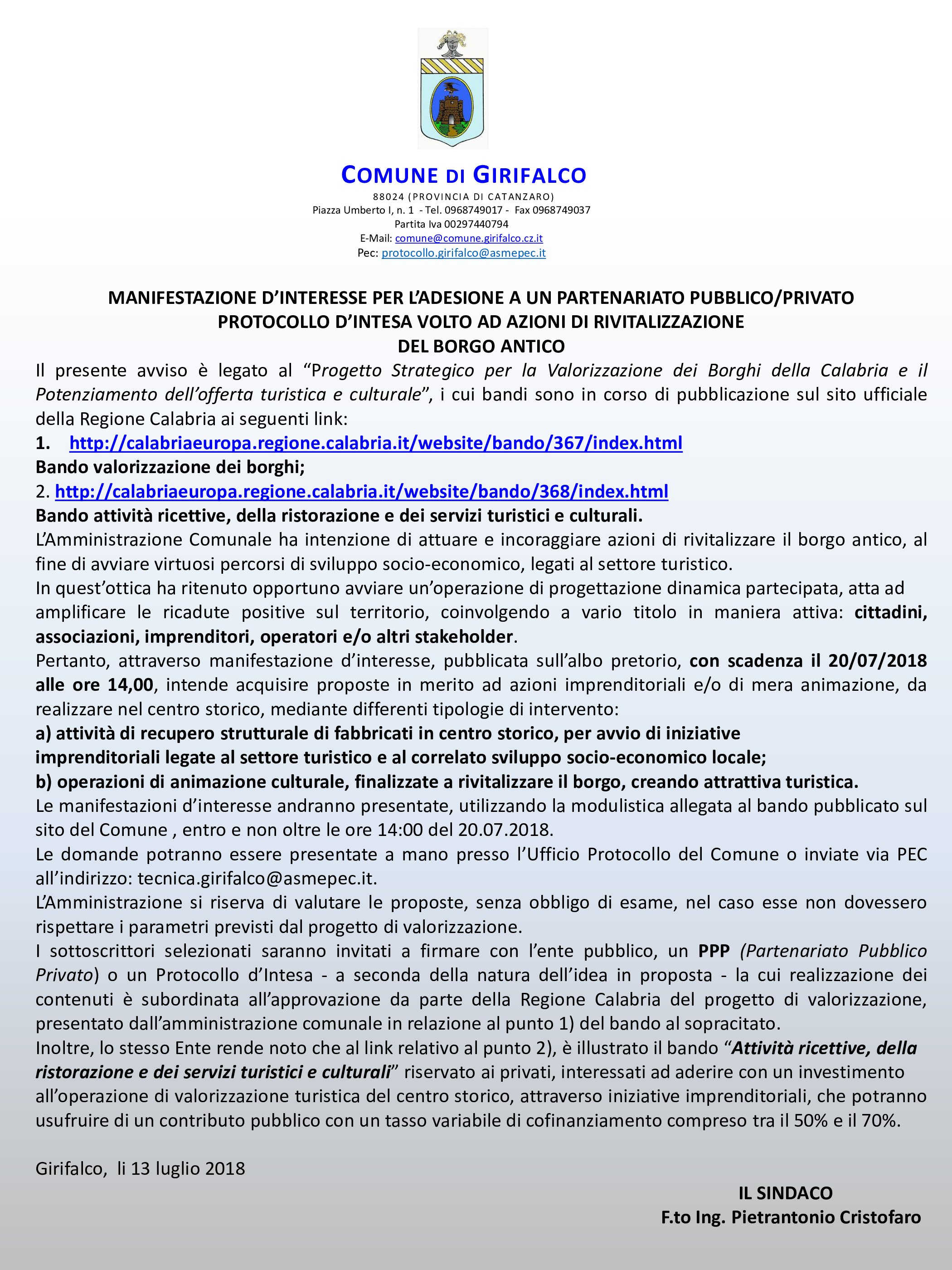 Il Comune di Girifalco, aderisce all’avviso pubblico per il sostegno dei progetti di valorizzazione dei borghi della Calabria. In più, approva lo schema di avviso ed allegati per manifestazione d’interesse a valere sul bando della Regione.