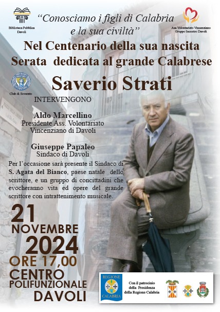 La Biblioteca Vincenziana di Davoli Marina omaggia il grande scrittore calabrese Saverio Strati (Sant’Agata del Bianco, 16 agosto 1924 – Scandicci, 9 aprile 2014) nel centenario della sua nascita, con un evento dedicato alla sua vita e alle sue opere.