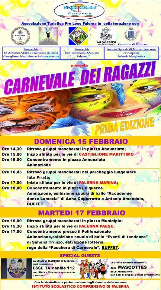 Intento principale del Carnevale falernese è la realizzazione di una sinergia positiva e la coesione tra i tre nuclei abitati, che costituiscono il territorio comunale. Falerna, infatti, abbraccia un’area ampia ed eterogenea, che va dal mare alla montagna. La Pro Loco ha, quindi, deciso di coinvolgere le classi scolastiche dei tre centri, afferenti ad ogni ordine e grado (dalla scuola dell’infanzia alla secondaria di primo grado). I personaggi ed i temi, impersonati dai bambini, saranno diversi, in relazione all’età dei partecipanti: “Fiabe e cartoni animati” per gli allievi delle scuole d’infanzia; “Bosco incantato” per le primarie; “Divina Commedia” per le secondarie. La manifestazione si articolerà in due giorni: domenica 15 febbraio a partire dalle 14:30 nel centro storico di Castiglione Marittimo e nella frazione Marina, martedì 17 dalle 15 in poi a Falerna Centro. Le sfilate prenderanno piede da Piazza Annunziata a Castiglione, dal lungomare fino al concentramento jn Piazza Le Querce a Falerna Marina, da Piazza Municipio fino a Piazza Ugo Floro ed al Centro Polifunzionale a Falerna. La kermesse vedrà la sfilata dei cortei mascherati, culminanti in momenti conviviali e di aggregazione dallo spiccato carattere socializzante e pedagogico. L’animazione sarà curata dalle mascotte di Loris Cario Animazione. Nelle due date si esibiranno due rinomate scuole di danza, operanti nell’hinterland: rispettivamente quella guidata da Anna Caparrotta e la “Artedintorni Energy” di Simona Trunzo.