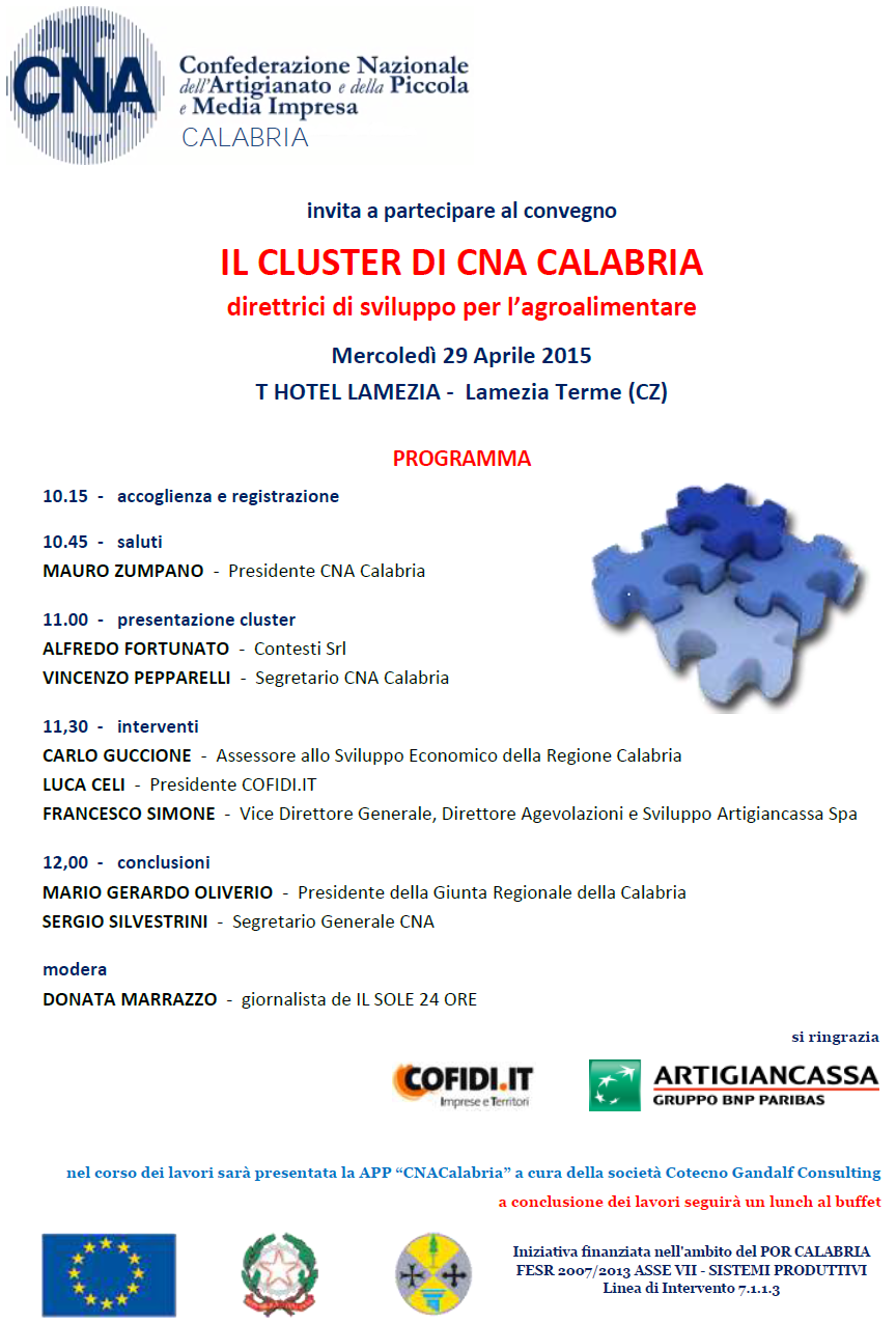 L’iniziativa è stata finanziata nell’ambito del POR CALABRIA FESR 2007/2013 (Asse VII – Sistemi Produttivi – Linea di Intervento 7.1.1.3). Gli importanti risultati conseguiti dal progetto saranno presentati in un apposito convegno che si terrà mercoledì 29 aprile 2015, alle ore 10.30, presso la sala convegni del T Hotel di Lamezia Terme (CZ). Tema dell’incontro sarà “Il Cluster di CNA Calabria: direttrici di sviluppo per l’agroalimentare”. Il ricco programma di interventi prevede i saluti del Presidente regionale della Confederazione, Mauro Zumpano.