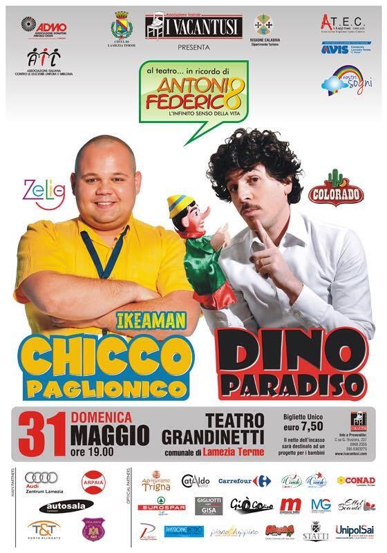 Domenica 31 maggio alle 19 al Teatro Grandinetti andrà di scena il grande cabaret con due artisti di calibro nazionale, che arrivano direttamente dai seguitissimi programmi “Zelig” e “Colorado”: si tratta degli inseparabili Chicco Paglionico e Dino Paradiso, che intratterranno il pubblico in una serata tutta da ridere. I proventi della serata saranno destinati al laboratorio teatrale stabile che verrà creato all’istituto comprensivo “Perri-Pitagora” e che sarà intitolato proprio al piccolo Antonio Federico. Un modo per mantenere vivo il ricordo di una persona speciale, ma anche per dare l’opportunità ai studenti di frequentare un laboratorio teatrale ed avvicinarli a questo mondo.