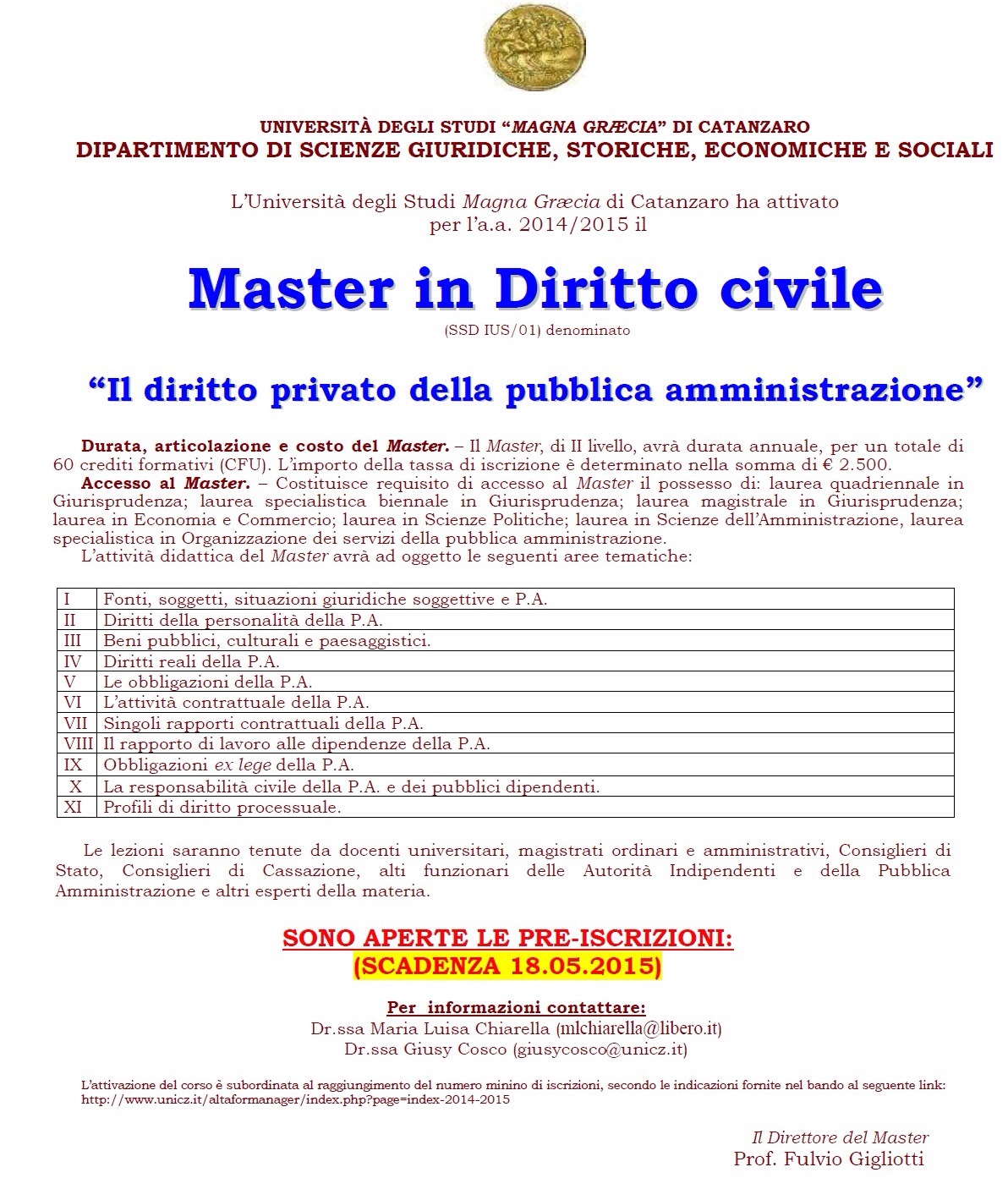 L’Università degli Studi Magna Græcia di Catanzaro ha attivato per l’a.a. 2014/2015 il Master in Diritto civile (SSD IUS/01) denominato :“Il diritto privato della pubblica amministrazione”. Il Master, di II livello, avrà durata annuale, per un totale di 60 crediti formativi (CFU). Costituisce requisito di accesso al Master il possesso di: laurea quadriennale in Giurisprudenza; laurea specialistica biennale in Giurisprudenza; laurea magistrale in Giurisprudenza; laurea in Economia e Commercio; laurea in Scienze Politiche; laurea in Scienze dell’Amministrazione, laurea specialistica in Organizzazione dei servizi della pubblica amministrazione. Le lezioni saranno tenute da docenti universitari, magistrati ordinari e amministrativi, Consiglieri di Stato, Consiglieri di Cassazione, alti funzionari delle Autorità Indipendenti e della Pubblica Amministrazione e altri esperti della materia. Sono attualmente aperte le pre-iscrizioni (scadenza 18.05.2015).