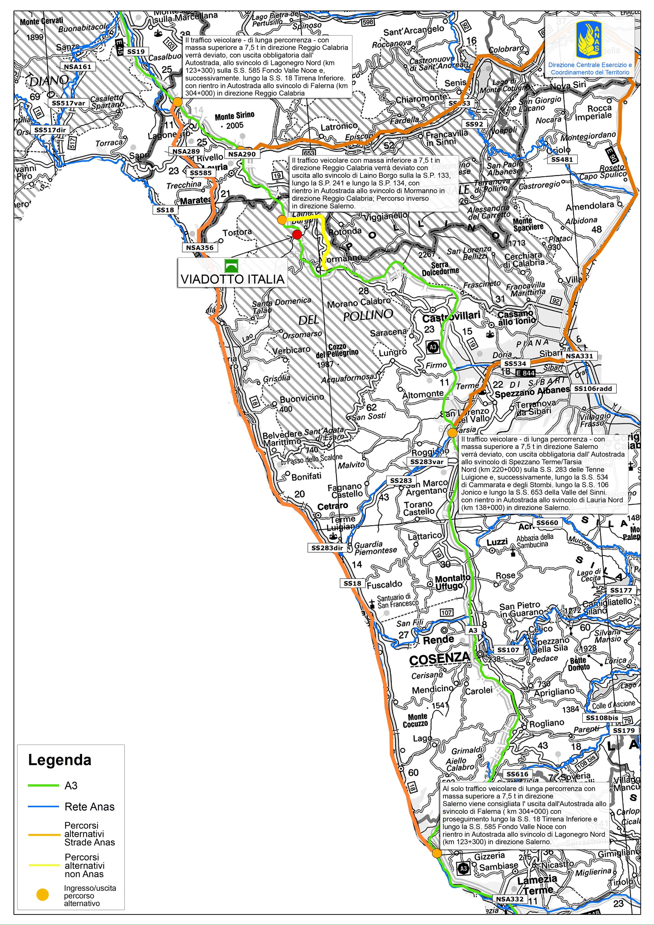 Per i veicoli leggeri in direzione nord è istituita l’uscita obbligatoria allo svincolo di Mormanno, percorrono le strade provinciali 134, 241 e 133 e rientrano in autostrada allo svincolo di Laino Borgo. I maggiori tempi di percorrenza sono stimati in circa 25 minuti.